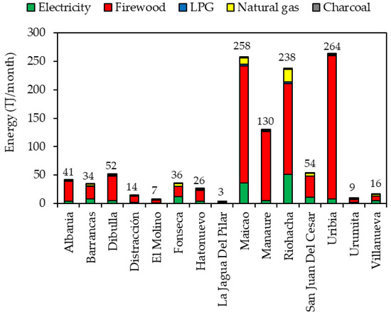 The department’s residential sector consumes 1183 TJ/month, including firewood (80%), electricity (13%), natural gas (5%), liquefied petroleum gas (LPG) (1%), and charcoal (1%) [32]. The municipalities of Uribia Maicao, Riohacha, and Manaure account for 80% of the energy consumed (Figure 2).