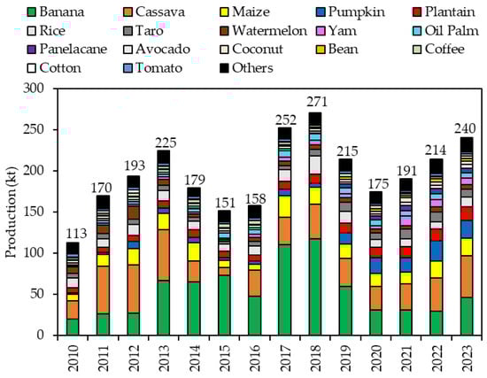 Since 2010, agricultural production in the department has more than doubled from 113 kt to 250 kt. The department’s main crops (banana, cassava, and maize) account for 41% to 70% of the departmental production, while other crops like rice, pumpkin, plantain, and malanga account for 13% to 29%.