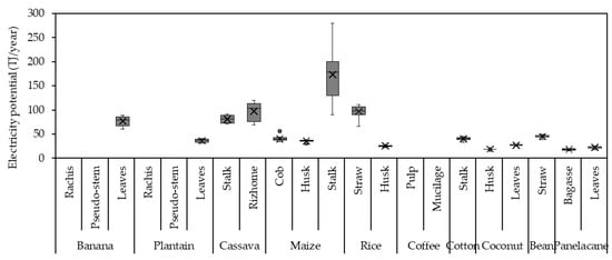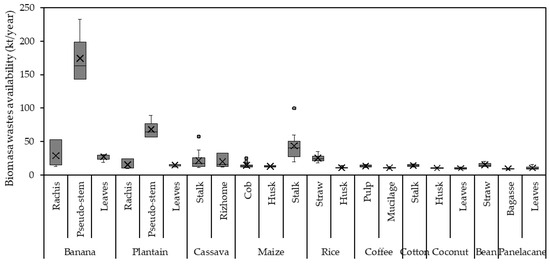 The availability of agricultural wastes for energy applications depends on collection procedures and competing uses. Sometimes, agricultural residues are used as a source of moisture and nutrients for the soil to prevent erosion, etc. Agricultural wastes of malanga, yam, pumpkin, tomato, and watermelon are mainly used to provide moisture and nutrients to the soil. Therefore, this study does not discuss these wastes as potential biomass sources. Furthermore, rejected fruits that fail the exporting quality standards are marketed for local consumption.