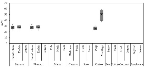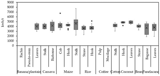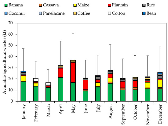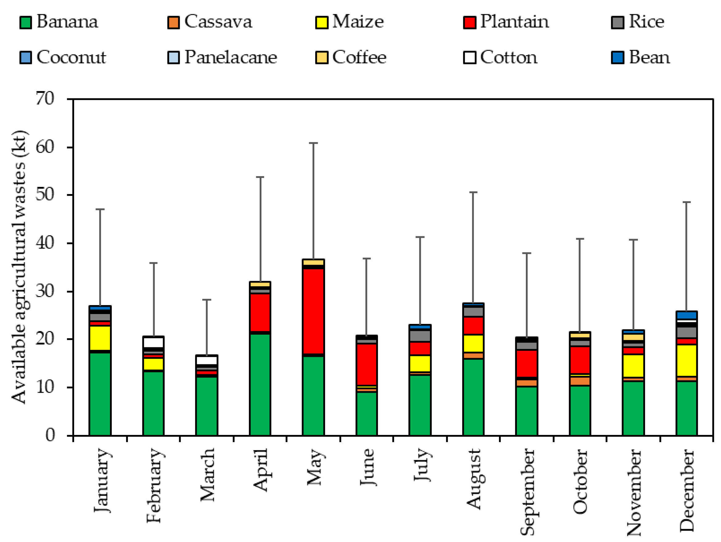 The availability of agricultural wastes for energy valorization varies from 24,398 to 43,559 t/month. Agricultural production peaks between April and May, coinciding with the rainy season [97,98].