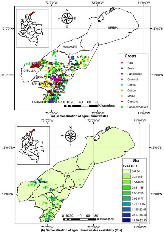 About 62% of crop waste is generated in Riohacha and Dibulla, while San Juan, Fonseca, and Distracción account for 6% each. These five municipalities generate 80% of the agricultural waste in the department (Figure 10). The geolocalization highlights the lack of agricultural activities in indigenous reservations. The municipalities of Uribia, Manaure, Maicao, Albania, Barranca, and Hatonuevo are arid regions with low agricultural potential and limited water availability. Also, large areas are exploited for coal mining (e.g., in the Cerrejón mine). The per capita generation of agricultural wastes varies between 1.3 and 1.7 kg/day in Albania and Hatonuevo, increasing to 9 and 13 kg/day in Dibulla and La Jagua because of a lower population density in these municipalities [46,47].