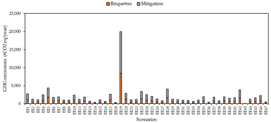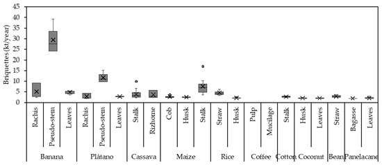 A mean value of 1/6 was considered for the mass ratio of briquettes produced to briquetting residues [112].