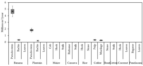 Bananas, plantains, coffee, cotton, and beans yield the highest mass of biomass waste.