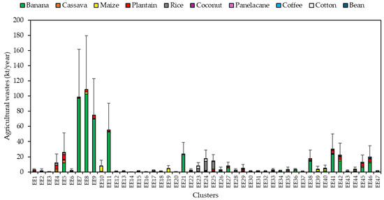 From 292 kt to 523 kt of agricultural wastes are available in rural areas for energy applications. Bananas and plantain pseudo-stems account for 49% of agricultural wastes; considering leaves and rachis, it increases to 60%. Moreover, maize accounts for 12%, cassava stalks represent 8%, while rice straw and beans crops account for 7%. Other crop wastes add up to 13%.