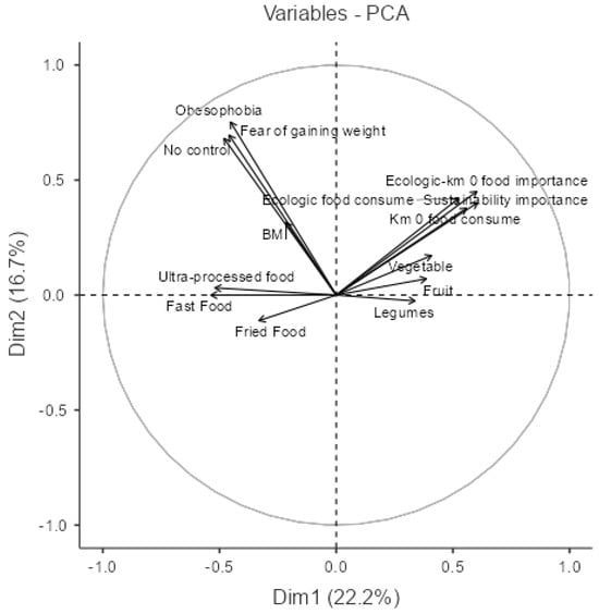 Figure 1 represents the plot of the variables in the PCA model. It can be seen how the variables No control, Obesophobia, and Body image are highly correlated (the arrows are at 0°) and are the ones that contribute the most to the model (they are the longest). Also, the variables of consumption of fast food, fried food, and ultra-processed food are reasonably correlated with each other, as are the variables of sustainability and organic and km 0 products with the consumption of fruit, vegetables, and pulses.