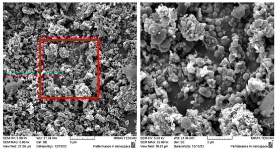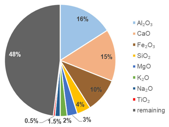 The biochar produced consists of various high-temperature aluminosilicates, primarily quartz and cristobalite (SiO2), with notable amounts of illite and traces of calcite (CaCO3) and calcium aluminum phosphate. Its calcium-based crystalline composition suggests a possible solid–solution formation due to the isostructural similarity among the phases. The sample shows overlapping weak-intensity maxima, complicating the identification of the less abundant components, and contains no amorphous phase. The absorption spectrometry analysis revealed that the biochar sample’s major components are Al2O3 (~16%), CaO (~15%), and Fe2O3 (~11%), with nearly half (48%) of the mass remaining undissolved, attributed to biochar carbon (Figure 2).