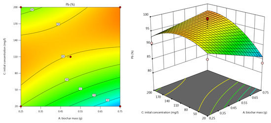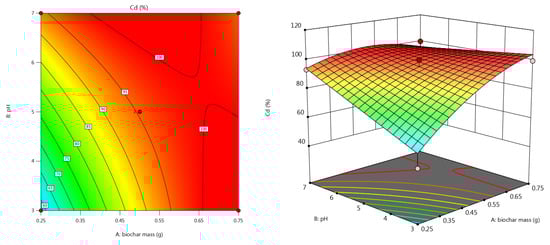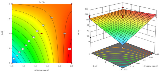 The contour plot and the 3D response surface for the combined effect of pH and biochar mass show their influence on Cu removal efficiency (Figure 11). As with Cd and Cr, a higher biochar mass and a higher pH value have a positive effect on Cu adsorption. However, here too, higher efficiencies are achieved under more acidic conditions with a biochar mass of 0.65 g or more. Tang et al. [43] also found that increasing the pH promoted Cu adsorption on biochar derived from pyrolysis at 500 °C, which could be due to the ion exchange effect of Ca2+, Mg2+, K+, and Na+, which are ubiquitous in municipal SS.