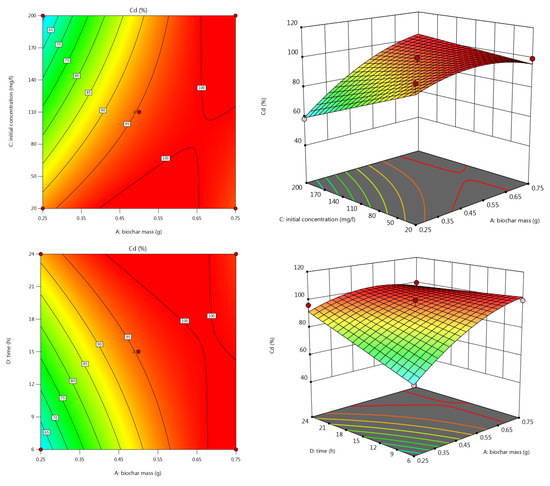 The interaction between the initial biochar mass and time (Figure 6 (bottom)) shows that Cd adsorption increases linearly with the duration of treatment. Notably, when using 0.60 g of biochar or more, the required treatment time for effective Cd removal is markedly reduced. For instance, achieving 95% Cd removal takes 24 h with 0.35 g of biochar, whereas only 6 h are needed when using 0.60 g of biochar. This highlights the efficiency of larger biochar amounts for accelerating the adsorption process.
