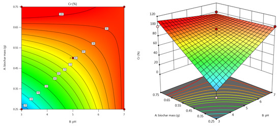 The contour plot and 3D response surface for the combined effect of pH and biochar mass show their influence on Cr removal efficiency (Figure 8). As expected, a higher biochar mass leads to higher Cr adsorption. An increase in pH also has a positive effect on Cr removal efficiency. In addition, about 0.65 g of biochar is sufficient to remove 90% of Cr regardless of the pH. Liu et al. [23] obtained opposite results. The highest removal capacity of total Cr (10 mg/g) was achieved with the lowest pH (pH 2) and the lowest magnetic (nano-zero-valent iron) biochar dosage (0.5 g/L), due to the reduction of Cr(VI) to Cr(III).