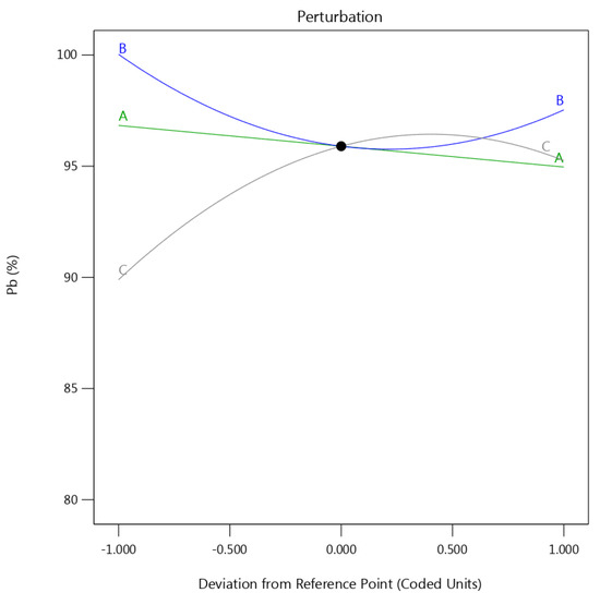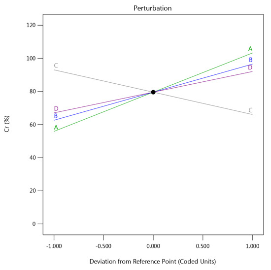 The perturbation plot in Figure 9 is used to compare the effects of all factors on Cr removal efficiency. Increasing the biochar mass, pH, and time has a positive effect on Cr removal efficiency. However, the removal efficiency decreases with an increase in the initial Cr concentration. In this case, Liu et al. [23] also obtained opposite results. The removal capacity of Cr increased with an increase in the initial Cr concentration. As for the reaction time, they reached equilibrium after 2 h.