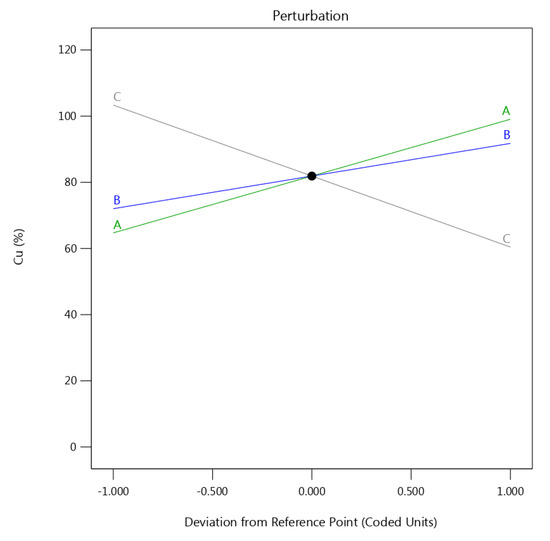 The perturbation plot in Figure 12 is used to compare the effects of biochar mass, pH, and initial Cu concentration on Cu removal efficiency. As with Cr, increasing the biochar mass, pH, and time positively affectes Cu removal, but the removal efficiency decreases with an increase in the initial Cu concentration.