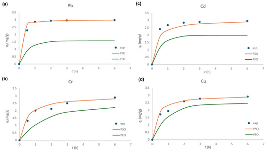 The results of this study align well with the findings of others, such as Ye et al. [54], where the maximum adsorption capacity for Pb was 40.8 mg/g and for Cd it was 24.2 mg/g. Shafiq et al. [48] also found that Pb ions are more quickly absorbed on biochar and have a higher maximum capacity. Although studies, such as those of Ye at al. [54], Shafiq et al. [48] and Zou et al. [50], have found that the Langmuir model better describes the adsorption of heavy metals onto various biochars, other authors, such as Khudair et al. [55] and Reddy et al. [56], have concluded that the Langmuir model is a better fit. Similarly to results of this study, Zhou et al. [44] concluded that both models can show a very good fit, depending on the heavy metal.