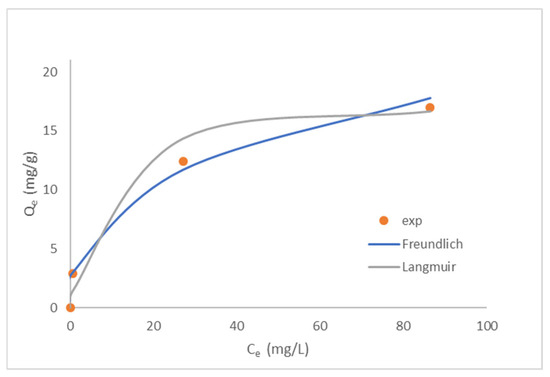 where qm is the maximum adsorption capacity, ce is the equilibrium concentration, and kl is the Langmuir constant [46,53]. The Freundlich isotherm describes adsorption on heterogeneous surfaces, suggesting multilayer adsorption, and is given by Equation (9):