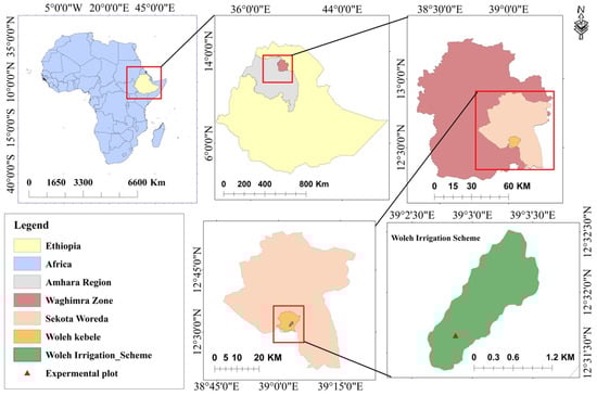 We conducted the study in the Woleh irrigation schemes in the Sekota district, situated within the Wag-Himra zone of northern Ethiopia (Figure 1). The area lies at a latitude of 13°84′766″ north and a longitude of 50°51′50″ east, boasting an elevation of 2105 m above sea level (masl). The average yearly maximum temperature varies between 23.1 °C and 28.6 °C. The study area exhibits a unimodal rainfall pattern, with the primary rainy season occurring from late June to early September [42]. The district experiences annual rainfall that varies between 329 mm and 799.5 mm. The majority of rainfall occurs from the first week of July through the end of August.