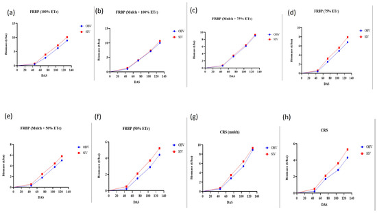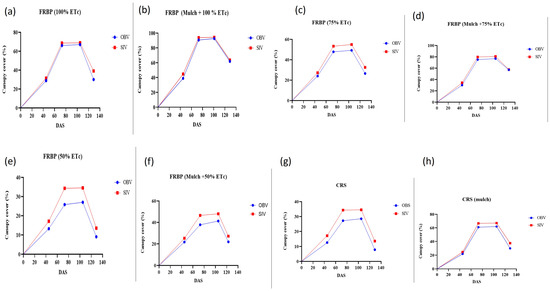 Calibrated results of maize CC (%) under FRBP at 100% ETc without mulch (a), FRBP at 100% ETc with mulch (b), FRBP at 75% ETc without mulch (c), FRBP at 75% ETc with mulch (d), FRBP at 50% ETc without mulch (e), FRBP at 50% ETc with mulch (f), CRS (g), and CRS with mulch (h) in the 2023–2014 irrigation season., where DAS = days after sowing, OBV = observed value and SIV = simulated value, FRBP = furrow-irrigated raised bed planting, and CRS = conventional ridge sowing.