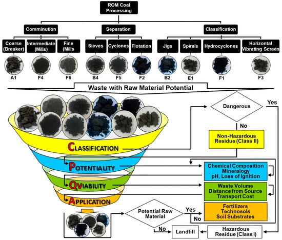 The residual fractions were selected based on the systematic CPQvA: classification (C), potentiality (P), quantity/viability (Qv), and applicability (A), proposed by Raupp-Pereira [26] as shown in Figure 1. The residual fractions were classified based on hazardousness, according to the NBR standards 10004 [27], 10005 [28], and 10006 [29]. The classification of waste, according to these standards, has been described in previous studies [30,31]. The potentiality criterion of use (P) was applied to the residual fractions, which were obtained from different ROM coal processing units used by the mining enterprises. The relevant quantity/viability (Qv) information was obtained from enterprises and the literature. For applicability (A), the integration between the potential characteristics of the different residual fractions and those required for the development of organo-mineral fertilizer was analyzed [32].