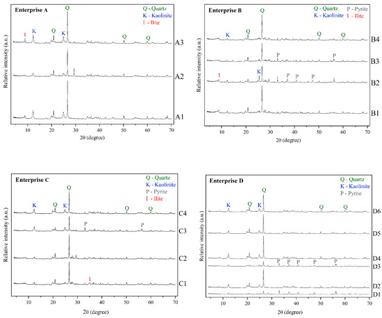The XRD analyses (Figure 2) demonstrated the presence of four mineralogical phases: quartz (SiO2, ICDD 00-085-0457), kaolinite (Al4(OH)8(Si4O10, ICDD 01-089-6538), pyrite (FeS2, ICDD 00-042-1340), and illite (KH3O)(AlMgFe)2(SiAl)4O10[(OH)2H2O], ICDD 00-029-1496). Pyrite is a phase related to iron sulfates and sulfides, with its identification in the XRD analysis supported by the SO3 content quantified in the chemical compositions of the residual fractions. A high fraction of silicon dioxide (SiO2) corresponded to the presence of silica minerals (primarily quartz sand) and the argillomineral kaolinite [48]. Silica compounds (SiO2) can be used as substitutes for limestone in crops [49]. However, its reactivity varies depending on the particle size, dose used, type of soil, and contact time between the material and soil [50,51]. Moreover, it is a non-reactive mineral and highly resistant to weathering, resulting in high soil porosity and drainage capacity [52].