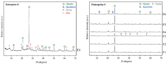 Finally, the pyritic sulfur was determined by titrimetric analysis, in which 2 g of the waste sample was digested in 50 mL hydrochloric acid (HCl) and 0.2–0.25 mL of ethanol (C2H5OH), and boiled for 30 min, followed by repeated washing with HCl and filtration. Sulfate (SO42−) was determined by neutralization titrimetry with HCl using the same procedure adopted for obtaining pyritic sulfur until the filtration stage, followed by the addition of 5 mL of oxygen peroxide (H2O2), boiling for 5 min, filtration, and the addition of 0.1 mL of methyl orange indicator. The amount of the sulfur forms was calculated, according to ASTM D2492 [34] as follows: