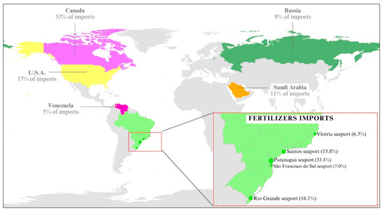 The percentage of fertilizers imports received by the major Brazilian seaports in 2018 and the countries of origin of these materials (Source: Adapted from [60]).
