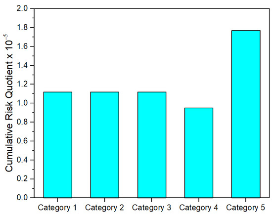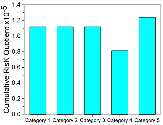 As seen in Figure 3 and Figure 4, both the cumulative hazard and risk quotient are well below one, suggesting a significantly low risk for the ingestion of PAH-contaminated groundwater. Similar results were obtained by Ganiyu [15], which investigated the value of the hazard index for the PAH-contaminated groundwater in Ibadan, southwestern Nigeria.