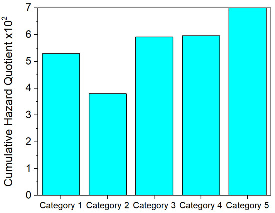 The cumulative hazard quotient was shown in Figure 5 after using a multiplication factor of 107 to highlight the hazard quotient for the Vidra landfill.