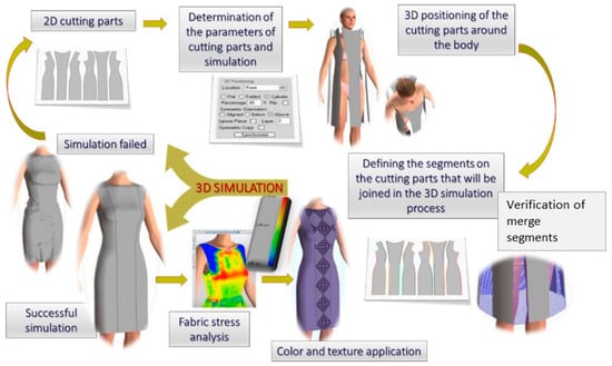 Wonderweaves, Reach technologies, Summagraphics, and Prostyle are some of the companies that offer textile design software for designing woven and knitted textiles. TUKA studio is an example of a CAD system that is suitable for both textile printing and weaving and enables complex weaving and color schemes [56,57]. An interesting study was conducted by Chae (2022) in the field of application of CAD systems in modeling color predictions for the weaving process when using multicolored yarn. The color of the woven fabric is determined by the different colors of the yarn, which are interwoven in a complex weave and in different proportions. Thus, predicting or reproducing the color of woven textiles from multicolored yarns is a difficult task that requires appropriate color mixing recipes. In his study, Chae (2022) proposes three-dimensional spectral reflectance-based color prediction models for single- and multi-layer woven fabrics, which have been shown to be beneficial for producing various woven fabrics in desired colors, and their potential application to CAD systems [58]. Digital Product Creation—DPC—is another concept related to fashion product development and prototyping that has recently been the focus of research and investment programs in the fashion industry [59]. It not only refers to the replacement of the physical sampling of new models in the development area but is already having a much greater impact on redefining the fashion industry. The creation of digital representations of fashion products and the creation of digital assets is influencing creative and commercial decisions, and there is almost no stage of the value chain where the importance of a digital fashion product is not recognized. With new approaches in design, as well as 3D simulation, virtual model fitting, and product visualization aimed at e-commerce, the creation of digital fashion products is expected to become even more important in the coming years and is crucial to achieving the strategic goals of fashion brands. DPC is a process that uses advanced technologies to conceptualize, design, develop, and manufacture 3D products in a virtual, collaborative environment. It offers an environmentally friendly and cost-effective alternative through material digitization, 3D pattern simulation, and 3D assets. The parallel use of a program to develop 2D pattern pieces and a program to perform a 3D simulation of a digital garment model enables the simulation of the assembly of the 2D pattern pieces and a realistic representation of the virtual garment on a 3D computer model of the human body with specific anthropometric features (Figure 3) [60,61,62].
