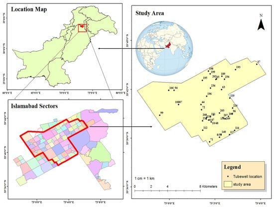 Geographical information system-based map of the study region indicating the locations of tube wells in Islamabad.