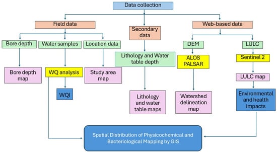 A systematic approach was used to create lithological maps by compiling and displaying geological data, using Strater software version 3.2.637. The initial geological data were provided by a geologist at the Capital Development Authority for various sectors within the research region. These data contained detailed information regarding the geological composition of sectors located at different depths below the surface of Earth. The creation of the Land Use Land Cover (LULC) map involved the use of Sentinel satellite data that were accessed via the Sentinel Hub website. The study region was analyzed using sensor data with an eminent spatial resolution of 10 m. To enhance image quality, pre-processing techniques were applied. Spectral classification techniques were then utilized to distinguish between the different types of land cover. Lastly, satellite imagery relevant to the study period was obtained. The resulting LULC map provided a thorough representation of land use patterns, successfully distinguishing between urban, vegetative, and other land cover types. This simplified the analysis of how urbanization affects the groundwater quality in the region under study. The overall methodology adopted is given in Figure 2.