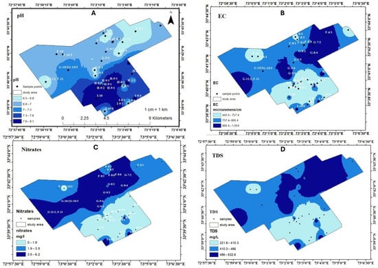 pH (A), EC (B), nitrates (C), and TDSs (D) in water samples.