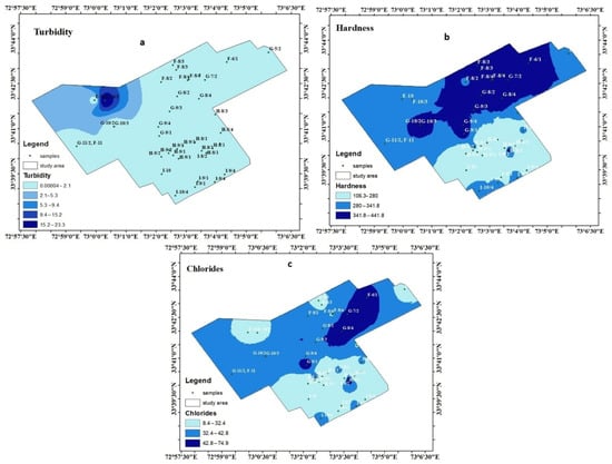 Concentration of turbidity (a), hardness (b), and chloride (c) in the samples.