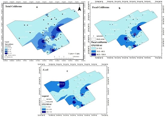 Total coliforms (a), fecal coliforms (b), and E. coli level (c) in water samples.
