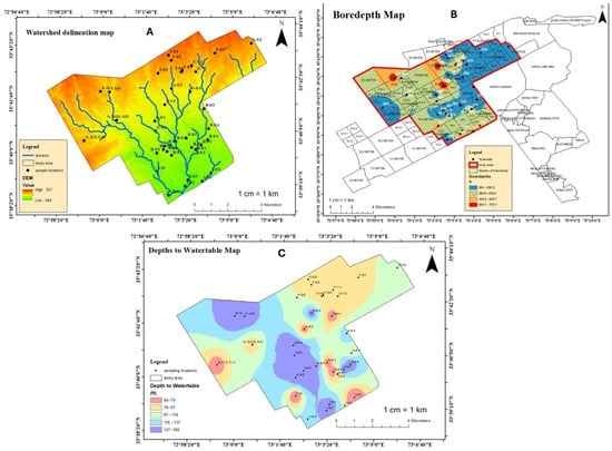 (A) Watershed delineation map, (B) depths of tube wells across the study area map, and (C) spatial variations in depth to water table.