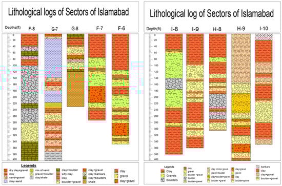 Significant insights into Islamabad hydrogeological dynamics have been gained from the analysis of water quality indices, especially in sectors G-7, G-8, G-9, and G-11, where EC levels exceeded the WHO-recommended limit and reached a maximum of 1054.5. There is a strong correlation between these elevated EC values and lithological data. More infiltration is seen in G-7 and G-8, where the upper strata have thinner clay layers, which causes more pollutants and minerals to infiltrate and combine with groundwater. It is likely that the elevated levels of EC observed at shallow depths are caused by a few factors. The peak pH values of 8.1 in sectors H-9/1, 1–10, and 1–9 are consistent with data from spatial maps and lithological logs, indicating a higher probability of infiltration due to the absence of upper clay layers (Figure 9).