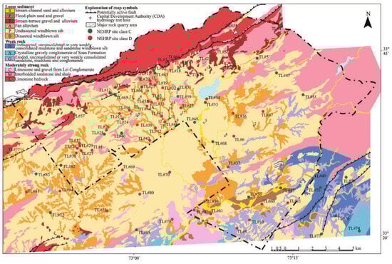 - Sheikh, I.M.; Pasha, M.K.; William, S.V.S.; Raza, S.Q.; Khan, K.S. Environmental Geology of the Islamabad-Rawalpindi Area, Northern Pakistan. In Regional Studies of the Potwar-Plateau Area 2008, Northern Pakistan; Bull G: 2078; U.S. Geological Survey: Reston, VA, USA, 2008. Available online: https://pubs.usgs.gov/bul/2078/B2078_chapter_G.pdf (accessed on 30 January 2025).