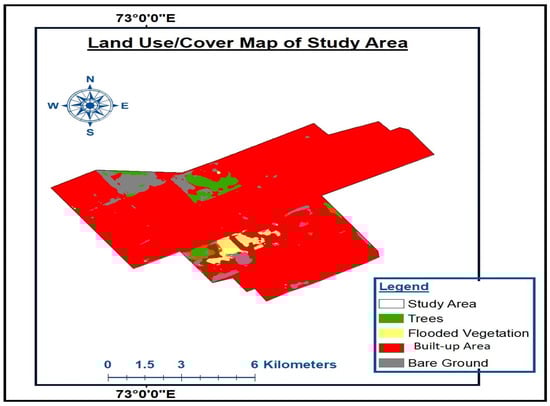 The goal of the Land Use and Land Cover (LULC) investigation was to classify and visually represent the variety of land uses in the target region, such as the natural, agricultural, and urban sectors. The LULC map helps to identify the potential pollution sources, links land use to groundwater quality measures, and provides information on land management techniques. Understanding the impact of human activity on groundwater resources is crucial as it facilitates the development of practical groundwater management strategies. The map of LULC obtained from Sentinel data (2022, 10 m resolution) displays a primarily urbanized terrain with a sparse amount of green areas signifying vegetation (Figure 11).