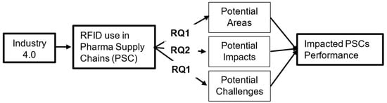 It is suggested that Industry 4.0 and, in particular, Radio Frequency Identification (RFID), part of the Internet of Things (IoT), Blockchain, and Unmanned Aerial Vehicles (UAVs), can support each of these areas. ‘The exploitation of the emerging technologies of Pharma Industry 4.0 facilitates sustainable value creation, leads to a more agile, smart and personalized pharma industry, and thereby, in the long-run, enables pharma companies to obtain competitive advantages’ [9]. It is anticipated that ‘emerging technologies of Industry 4.0 will allow pharma SCMs to upgrade their entire operation systems to become smarter, more flexible and sustainable in achieving better company reputations, brand images, and competitive advantages in the long term’ [9]. The objective of this study is to explore the possible areas of introduction for Industry 4.0 technologies through the use of RFID technology, to improve the PSC, and to develop contemporary, reliable PSCs in support of the growing demand for medication and the desire for a provider to have a CA. This research will also identify concerns which could be potential barriers to execution and recommend how these may be addressed. RFID technology is a tool seen to prevent counterfeit drugs from infiltrating the supply chain [10,11,12]. Research has been extensively conducted on RFID implementation in the supply chain. Implementing RFID technology in pharmaceutical supply chain may produce more sustainable systems [13]. However, research on how its integration contributes to achieving competitive advantage and creating long-lasting sustainability remains limited. Also, as RFID technology is considered one of the technologies of Industry 4.0, it is important to gather insights from industry practitioners to document their impact within this context rather than solely relying on theoretical insights from the widely available published review articles. The ongoing developments within Industry 4.0 and the PSC provide abundant avenues for research. To focus the research and provide a concise area of study, three specific RQs will be addressed.