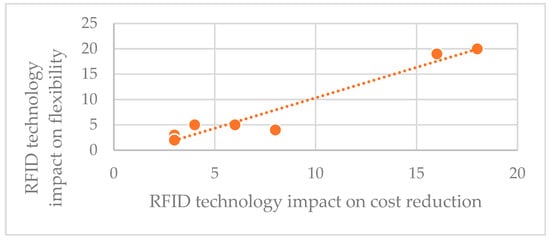 Speed was a frequently mentioned positive impact in relation to RFID technology, and both refs. [26,30] agree, citing increased rates of identification and improved inventory management efficiency as outputs of using the devices. The results also show high positive correlations between RFID technology impacts on cost reduction vs. flexibility, as illustrated in Figure 4, and between quality vs. service delivery reliability, as illustrated in Figure 5 below.