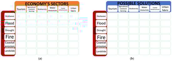 The first consultation was divided into two sessions: a presentation of the current and possible future impacts of climate change on the region of Sitia and a set of collaborative activities to identify the most critical climate hazards for the area, as well as the most vulnerable economic sectors, and to brainstorm possible adaptive interventions. To assess and quantify the multiple risks in the area of interest given the likelihood of a hazard and the determined impact, the risk matrix methodology was followed. To elicit a thorough evaluation of the region’s sensitivity to climate threats and the impact of extreme events within each sector, two activities were prepared, where stakeholders had to fill out two matrixes (