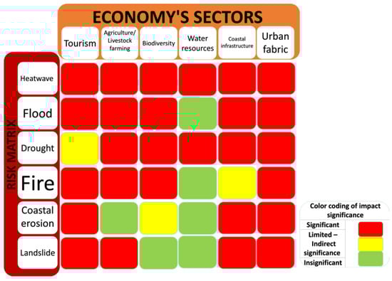 Figure 7) for each sector based on citizens’ perceptions. This matrix highlights the different levels of risk that natural hazards pose to different sectors, helps guide preparedness and resilience planning, and serves as a tool for prioritizing mitigation and adaptation strategies in response to potential risks. The colour coding indicates the level of impact: red for significant, yellow for limited/indirect and green for insignificant.