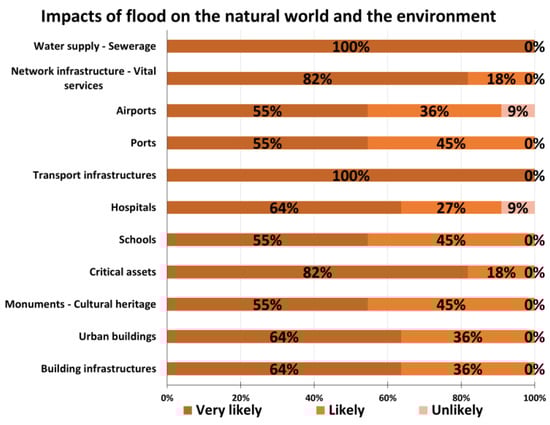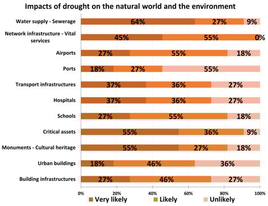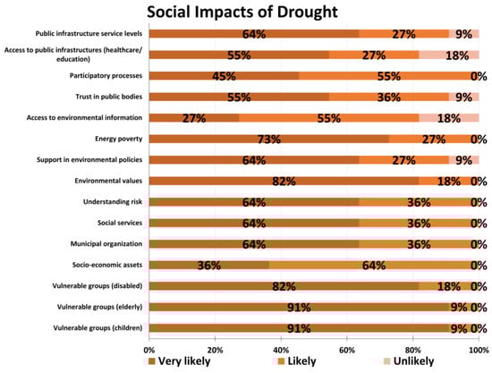 Figure 14), revealing concerns encompassing infrastructure, societal values, and the well-being of vulnerable groups. Starting with public infrastructure service levels, a significant majority perceive floods to have a high likelihood of impact while, on the other hand, they view the impact of drought as slightly less imminent. Access to public infrastructure, such as roads and bridges, appears to be a significant concern in the event of floods, with a majority believing it to be very likely to be impacted, compared to droughts, emphasising the physical damage floods can inflict on such structures. Participatory processes and trust in public bodies are equally considered susceptible to both hazards, albeit with a higher anticipation of impact from floods.