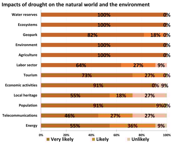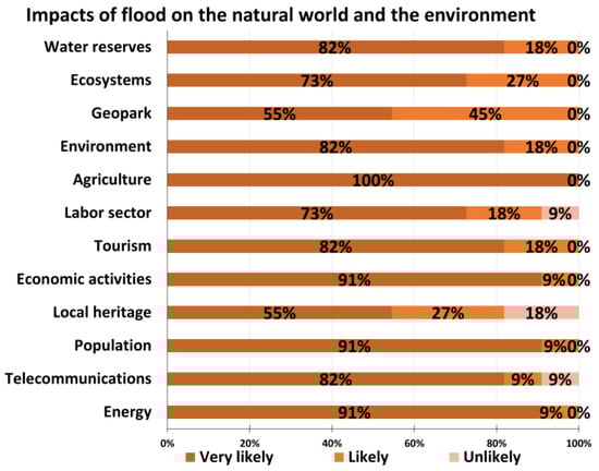 Figure 12), with all stakeholders agreeing on the highly likely impacts, indicating their understanding of the fragile balance within ecosystems. Concerns about the Geopark, the designated area for the preservation of natural heritage, is notable, with the majority considering it to be at risk, with a higher expectation of drought as a likely impact compared to floods.