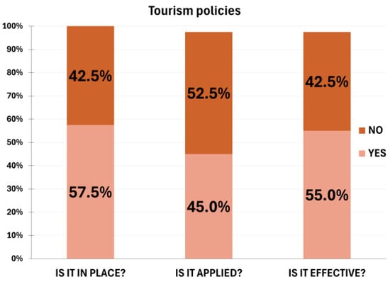 Figure 15) illustrates local stakeholders’ perceptions of climate change policies within the tourism sector. Starting with the question of whether they are aware that specific policies exist, more than half of the stakeholders acknowledged the policies in question and that these were actually in place. Nevertheless, the findings also showed that a sizable section of the population is ignorant of these regulations and, as a result, is not fully aware of all the resources the government has made available to assist them. Moving on to the implementation of these policies, the majority of people do not see them being implemented, despite their belief that they are valid.