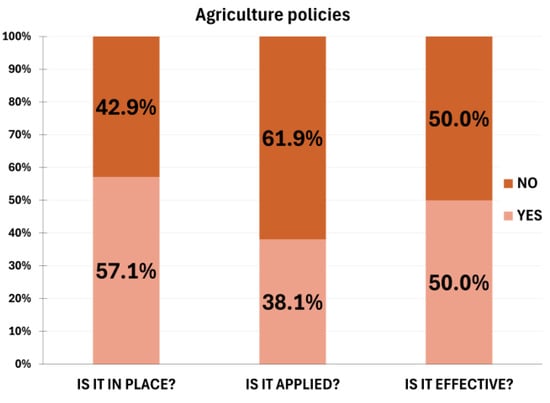 Figure 16) unveils stakeholders’ perceptions of the climate change policies associated with agriculture. A slight majority of the local stakeholders were actually aware of the climate change policies related to agriculture. However, those who were unaware of such policies pointed to a potential gap in policy communication, or perhaps a disconnection between policy formulation and public awareness. The application of agriculture-related policies was viewed more critically. A significant majority did not perceive these policies as being applied. When evaluating the effectiveness of the applied policies, opinions were divided evenly. Half of the stakeholders were convinced of the policies’ effectiveness. The other half, however, were sceptical, which could reflect either a lack of tangible results, insufficient impact, or possibly even negative consequences of the policy measures that have been perceived.