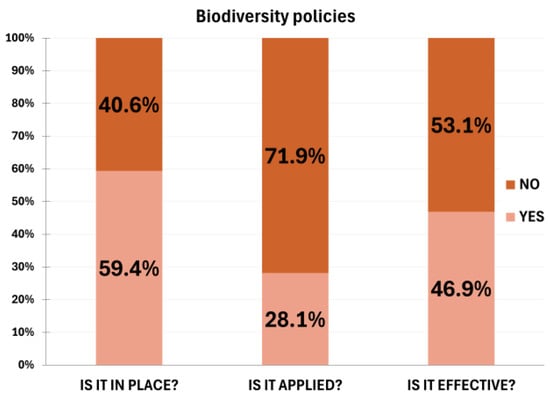 Figure 18) concerning stakeholders’ perceptions of biodiversity-related climate change policies displays the community’s insights on these environmental strategies. Beginning with the existence of such policies, a significant majority acknowledged their presence, indicating that stakeholders were generally aware of the measures aimed at protecting biodiversity amidst climate change. However, a substantial number of people were not informed about these policies, which raises questions about public engagement and the visibility of these policies. The application of these policies was viewed with notable scepticism. Some respondents felt that the policies were not being applied, painting a stark picture of inaction. In terms of effectiveness, perceptions are closely divided, with a slight majority not convinced of the impact of the policies.