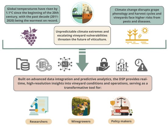The DSP presented in this study advances precision viticulture by addressing the immediate and long-term challenges posed by climate variability and fragmented data management. Unlike conventional vineyard management systems, which primarily rely on manual observations and historical climate trends, the proposed DSP integrates real-time IoT-enabled data, predictive modeling, and stakeholder collaboration. Thus, it forms a knowledge-driven approach that bridges the gap between data acquisition, interpretation, and actionable decision-making.