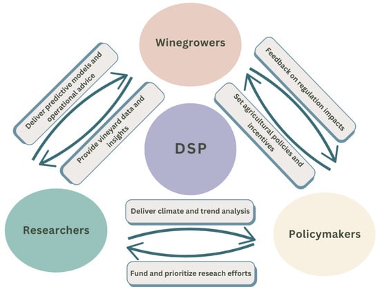The interconnected framework of the DSP, displayed in Figure 3, highlights how the platform unites researchers, winegrowers, and policymakers to foster collaboration and data-driven decision-making. By integrating diverse datasets and providing tailored insights, the DSP enables researchers to refine predictive models, winegrowers to optimize vineyard operations, and policymakers to develop evidence-based strategies. This holistic approach ensures that all stakeholders work together to tackle climate challenges, enhance sustainability, and improve resilience within the viticulture sector.