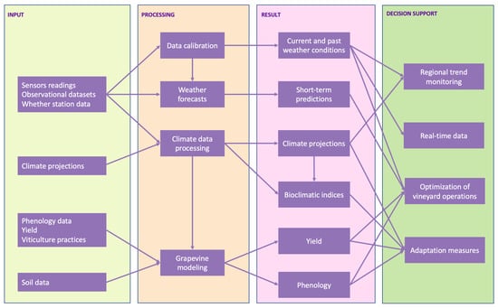 The designed DSP is complex, but in terms of an input/output overview, Figure 5 illustrates the projected approach. Subdivided into four parts, input data, process, results and decision support, it is ceded to platform users the synthesized decision support information, and optionally the results. The input data includes sensor readings from vineyards, weather station data maintained by the Institute of Hydrometeorology and Seismology of Montenegro, and observational datasets such as E-OBS [18] and ERA5-Land [19], and CHELSA-W5E5 [60]. These datasets allow us to correct and calibrate sensor data that can be decalibrated by local conditions, provide weather forecasts in the vineyards, and are also useful for climate data processing, for bias adjustment of climate projections [61]. Climate projection data are available from sources such as the Coupled Model Intercomparison Project Phase 6 (CMIP6) [62] and the third simulation phase of the Inter-Sectoral Impact Model Intercomparison Project (ISIMIP3b) [63], which incorporates the Shared Socio-Economic Pathways (SSPs). These can be downscaled to 1 km to properly portray Montenegro’s climate conditions due to the complex topography, with algorithms such as the CHELSA algorithm [55,56,57]. Alternatively, higher resolutions can be achieved by algorithms such as NicheMapR citex [64]. In this sequence, processed climate data serve as input for future phenology and yield modelling. Among these task–candidate approaches are ML [65], growing degree days and statistical models [66], and a generic soil crop model (STICS) [67]. The choice of the models, for each vineyard, is dependent on the available data, which comprises, yield, phenology and viticulture practices. Also, soil properties are necessary, at least for robust tools such as STICS. Preferably soil properties (for example: texture, water holding capacity), must be collected on-site, however, the Land Use and Coverage Area Frame Survey [68] and European Soil Database [69] can be used to provide soil property estimations. With all these inputs, it is possible to provide yield and phenology predictions to support wine growers, and conjunctly with bioclimatic indices, it is possible to ceed the suitable adaptation measures in each vineyard. Also, the real-time data provided by sensors supports optimizing vineyard management, providing short-term measures, crucial to develop sustainable yield and executing short-term operations, such as pruning. By storing and accumulating weather station data, it is also possible to monitor the climate trends, to adjust future decision support.