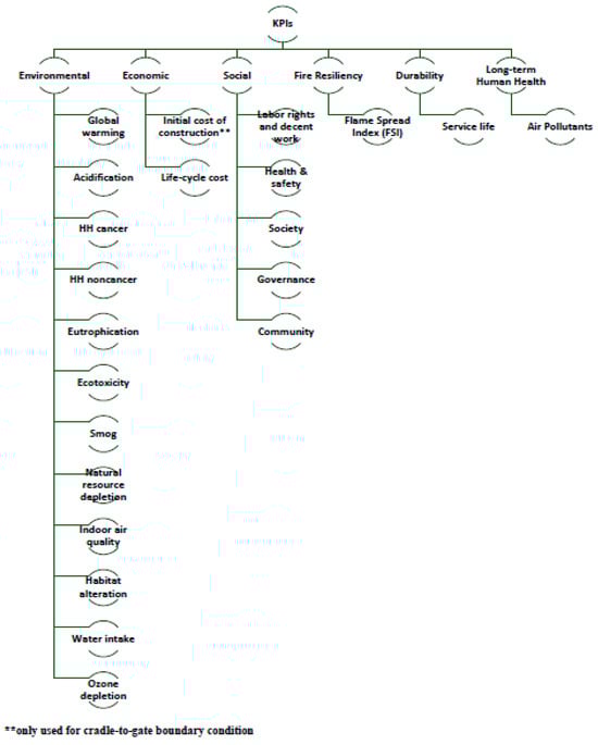 Furthermore, the assessment also considered the two different boundary condition for the life-cycle sustainability: cradle-to-gate, and cradle-to-grave. Firstly, both cases were assessed for the cradle-to-gate boundary condition where only raw material extraction to its manufacture is considered. Then, after, both of the cases were assessed for the cradle-to-grave boundary condition where the whole life of the building was considered up to its end-of-life and the reusability of waste materials. Figure 2 provides the detailed list of KPIs considered for both types of cases with each boundary conditions. The value for the FSI, service life, and air pollutants were considered based on details provided in the above step 2 under methodology (Table 2, Table 3 and Table 4).