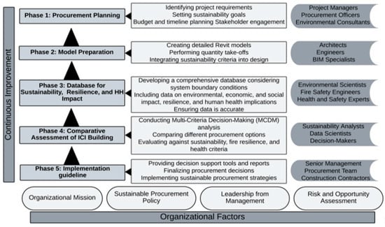 The sustainable procurement framework outlined for the construction industry represents a comprehensive and structured approach, emphasizing continuous improvement and alignment with organizational goals. By breaking down the process into five distinct phases—procurement planning, model preparation, database for sustainability, resilience, and human health impact, comparative assessment of ICI buildings, and implementation guideline—the framework ensures that sustainability is woven into every stage of procurement. Each phase is characterized by specific tasks and involves a range of stakeholders, from project managers and procurement officers to architects, environmental scientists, and senior management. This multi-stakeholder involvement is crucial for ensuring that sustainability considerations are thoroughly integrated into project planning, design, data management, assessment, and implementation, thus promoting a holistic approach to sustainable construction.