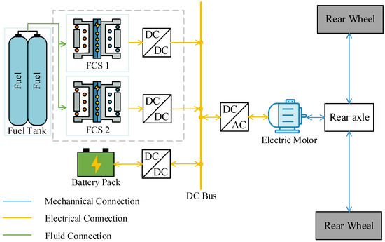 This section is dedicated to modeling the powertrain components of a fuel cell hybrid mining truck. Initially, the powertrain configuration of the hybrid mining truck under study is introduced. Next, the models for essential powertrain components, including the PEMFC system, electric motor, and battery, are examined.